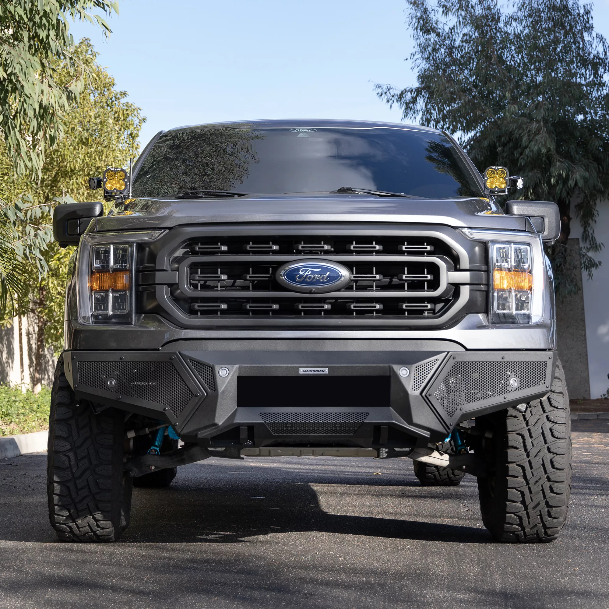 Go Rhino’s Element Front Bumper features modern styling that dramatically improves a truck’s factory appearance. The 14 gauge 1/8” steel bumper shell is designed with lifted corners for the tire and ground clearance needed while off-roading. Attractive mesh panels help reduce weight, improve air flow, and are paintable if a customized look is desired. Bumpers…