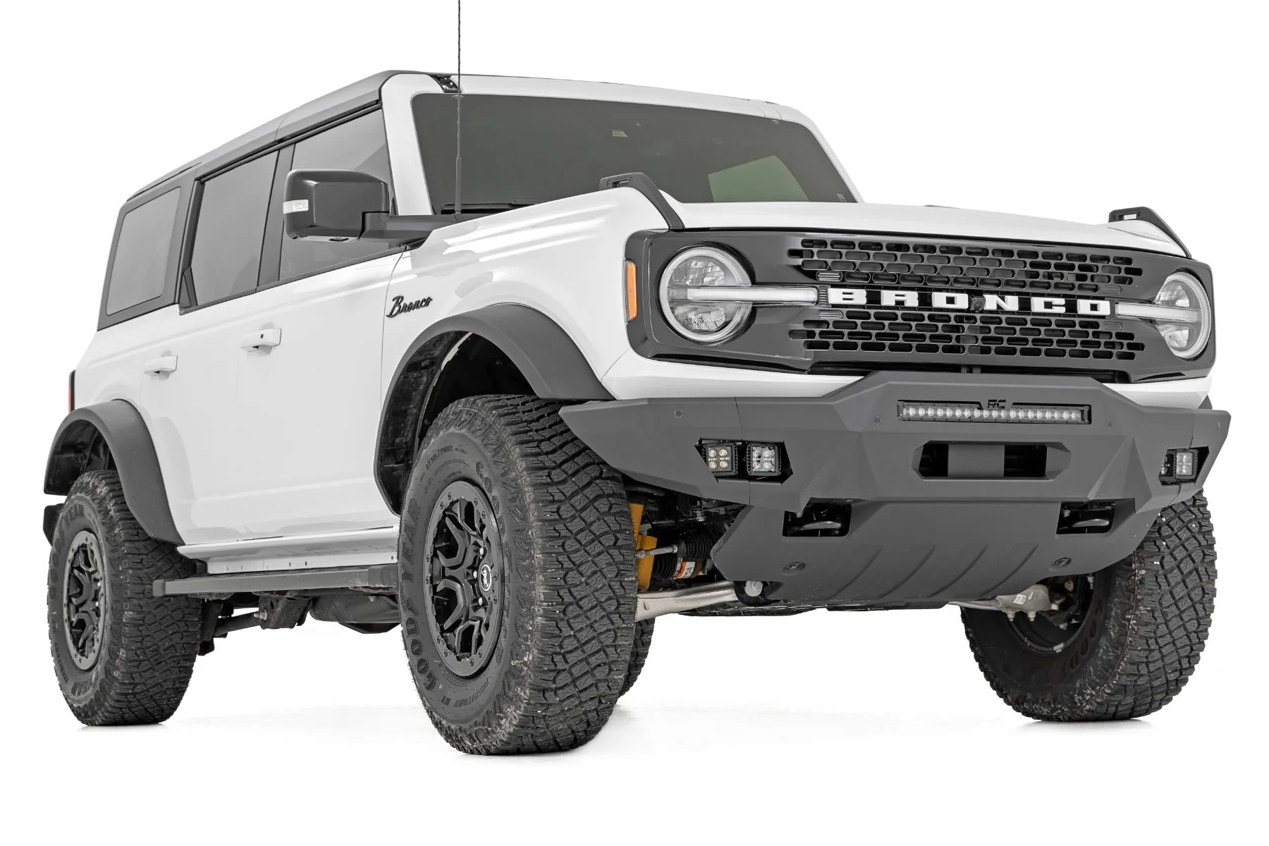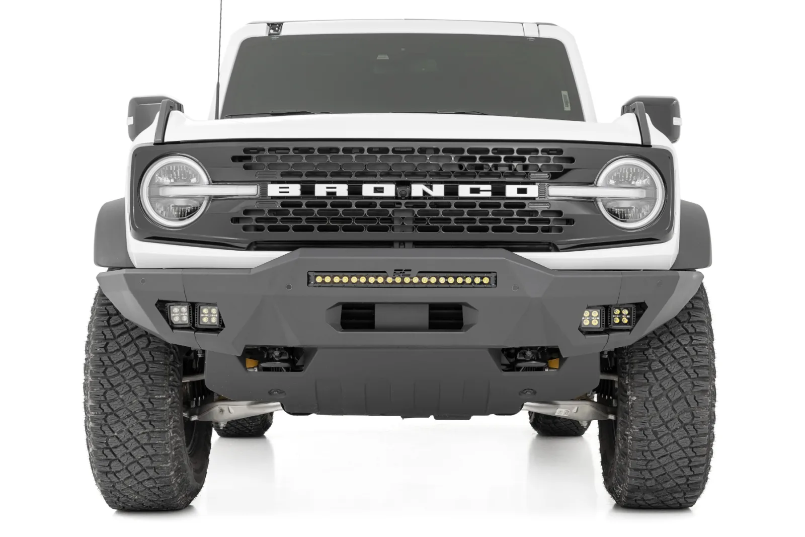 Add an Aggressive Style. Looking to add some attitude to your Bronco? Check out our Rough Country Front Bumper. This bumper will transform the appearance of your vehicle and protect your lights and engine from potential damage. Manufactured to be a perfect fit for your Bronco and provide maximum ground clearance, our bumper is designed to overlap the factory grille shell for looks and light bar fitment. Since it fits Rough Country’s 20″ light bars, with an option to add additional cube lighting on the side, you can upgrade your visibility at night and give your vehicle a touch of style. Modular Design. Rough Country’s High Clearance Bumper Kit is modular, letting you pick and choose the options you prefer. Spanning the line of our high-quality black series LED light bars and LED cube lights, YOU can decide the combination that best suits your needs! Boasting an impressive 14,400 lumens of combined lighting power you’re sure to see the trails on your next outing. Each bumper features high clearance full wings that provide additional protection when tackling the trails! Installation. Requiring minor splicing, an estimated timeframe of 3-4 hours is suggested to complete the installation process. With the included step-by-step instructions this high-quality unit can be assembled and installed at home! Limited Lifetime Replacement Warranty. Rough Country’s High Clearance Bumper Kit is backed with a limited lifetime replacement warranty towards manufacturer defects. As such, the product is protected from structural and workmanship damage after the date of purchase. With our industry-leading warranty give yourself peace of mind when using Rough Country’s Suspension products!