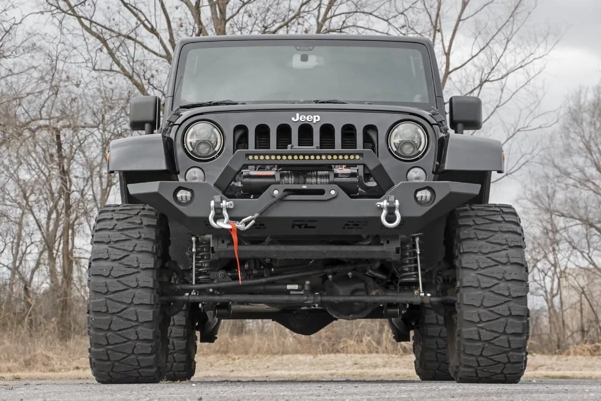 Upgrade Your Jeep’s Front End: Give your Jeep aggressive styling and unmatched protection with Rough Country’s Full Width LED Winch Bumper. Engineered from heavy-duty 5/32-inch steel and reinforced with 2x.120-inch tubing, this bumper is built to handle the toughest trails while enhancing your rig’s rugged appearance. Full-Width Strength with Trail-Ready Clearance: Designed to complement factory flares or aftermarket modifications, this bumper features tapered ends and a high-clearance profile for improved approach angles and articulation when tackling obstacles head-on. Light the Way Forward: An integrated 20-inch Single-Row Rough Country LED Light Bar delivers 7,200 lumens and 100 watts of powerful forward-facing illumination, ensuring you’re ready for night rides and low-visibility conditions. Built-in fog light ports retain your factory lights, complete with a unique “angry eyes” look that adds extra attitude. Ready for Recovery: Whether you’re hitting deep mud or rocky terrain, this bumper has you covered with a built-in winch plate that accommodates any standard-size winch. A set of included 4.75-ton capacity D-rings and reinforced D-ring mounts, welded inside and out, provide dependable recovery points you can trust when the trail gets rough. Built to Last: Finished in a sleek satin black powder coat, this bumper not only looks sharp but also provides superior corrosion resistance against the elements.
