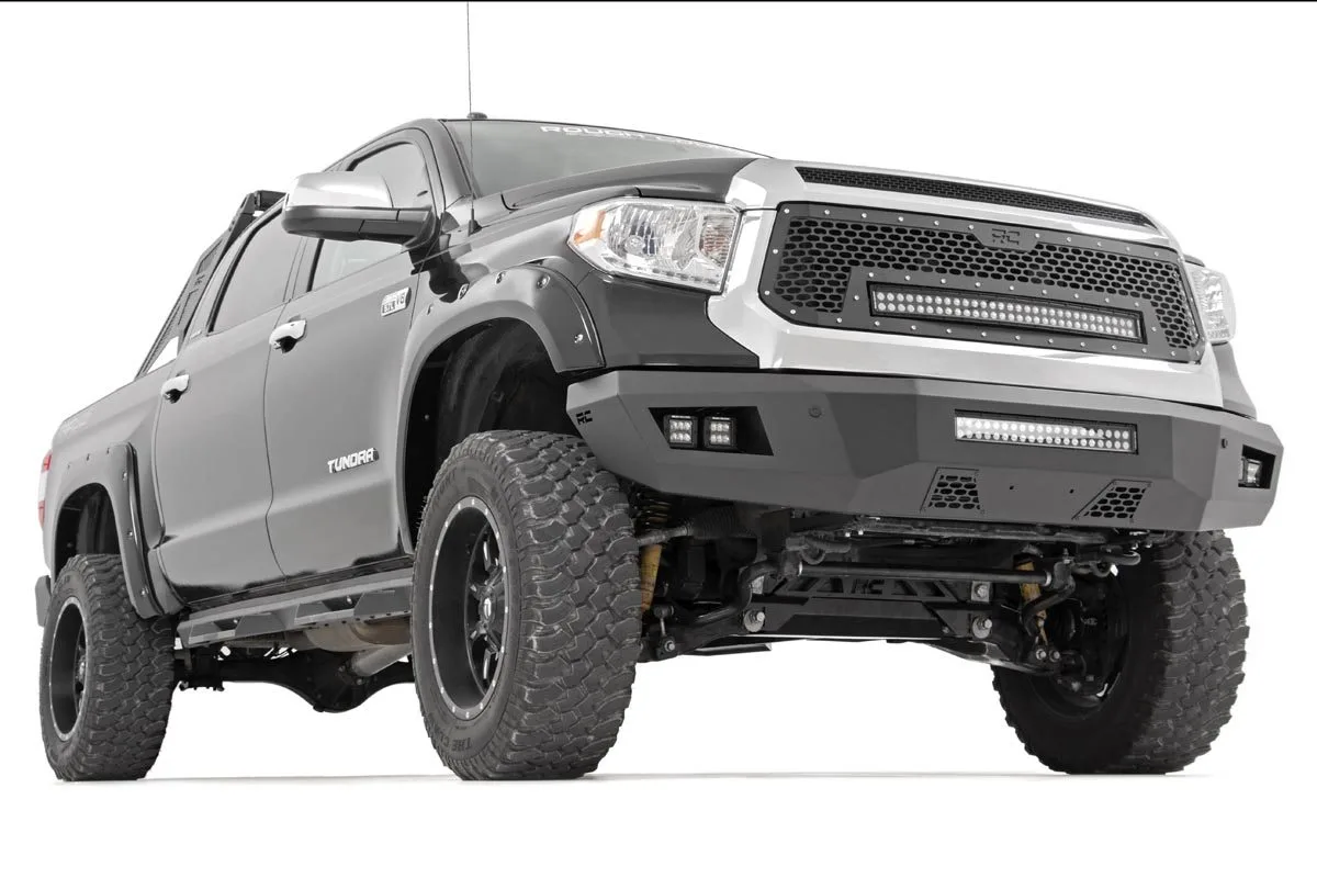 Give the front of your Toyota Tundra an aggressive, new appearance with Rough Country’s Front LED Bumper. This easy-to-install upgrade gives your truck an improved look and better protection that offer impressive off-road illumination! Rough Country’s Front LED Bumper is made of a durable, all-steel construction. Each bumper features four Rough Country 2in LED Cubes and a 20in LED Light Bar that offer over 15,000 lumens of combined lighting power. Each bumper also includes sensor relocators to allow you to retain the vehicle’s anti-collision system. This incredible front bumper system is powder coated flat black and is ready to withstand the elements for a long lifespan of good looks. Rough Country’s Front LED Bumper is also easy to install with no cutting or drilling required! Complete the look with Rough Country’s Rear LED Bumper for a total transformation of your truck.