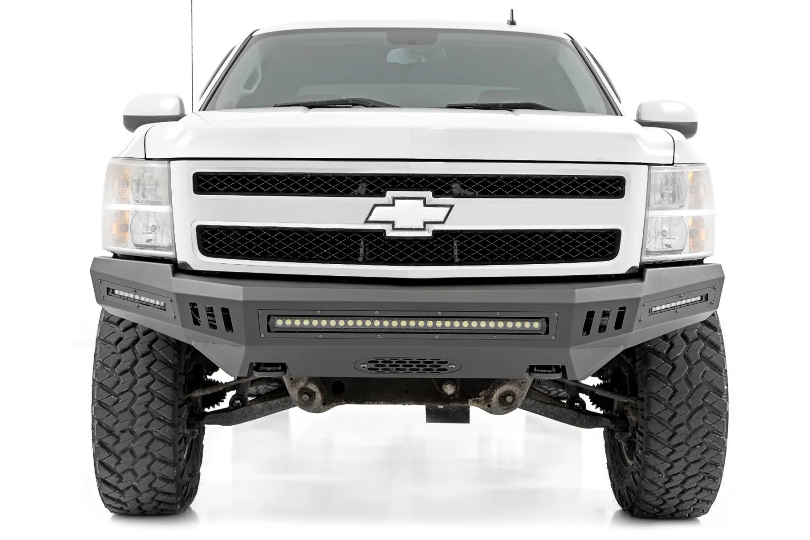 Update the look of your 07-13 Chevy Silverado 1500 with Rough Country’s High Clearance Bumper. This cost effective mod comes ready to install straight out of the box, giving your truck the tough look it deserves quickly and easily. Rough Country’s High Clearance Bumper is modular, you can pick and choose the options best suited to your needs and the look you re going for. Each bumper features trim plates and mounting options that allow you to run a series of LED lights for impressive illumination and includes a winch mounting plate. Optional LED upgrade kit includes (1) 30in Single Row LED and (2) 10in Slimline LEDs. For a more classic look, simply use the provided trim panels for a sleeker appearance. Our High Clearance Bumper comes with durable, flat black powder coat finish, ready to withstand the elements -No painting required for a hassle-free install.