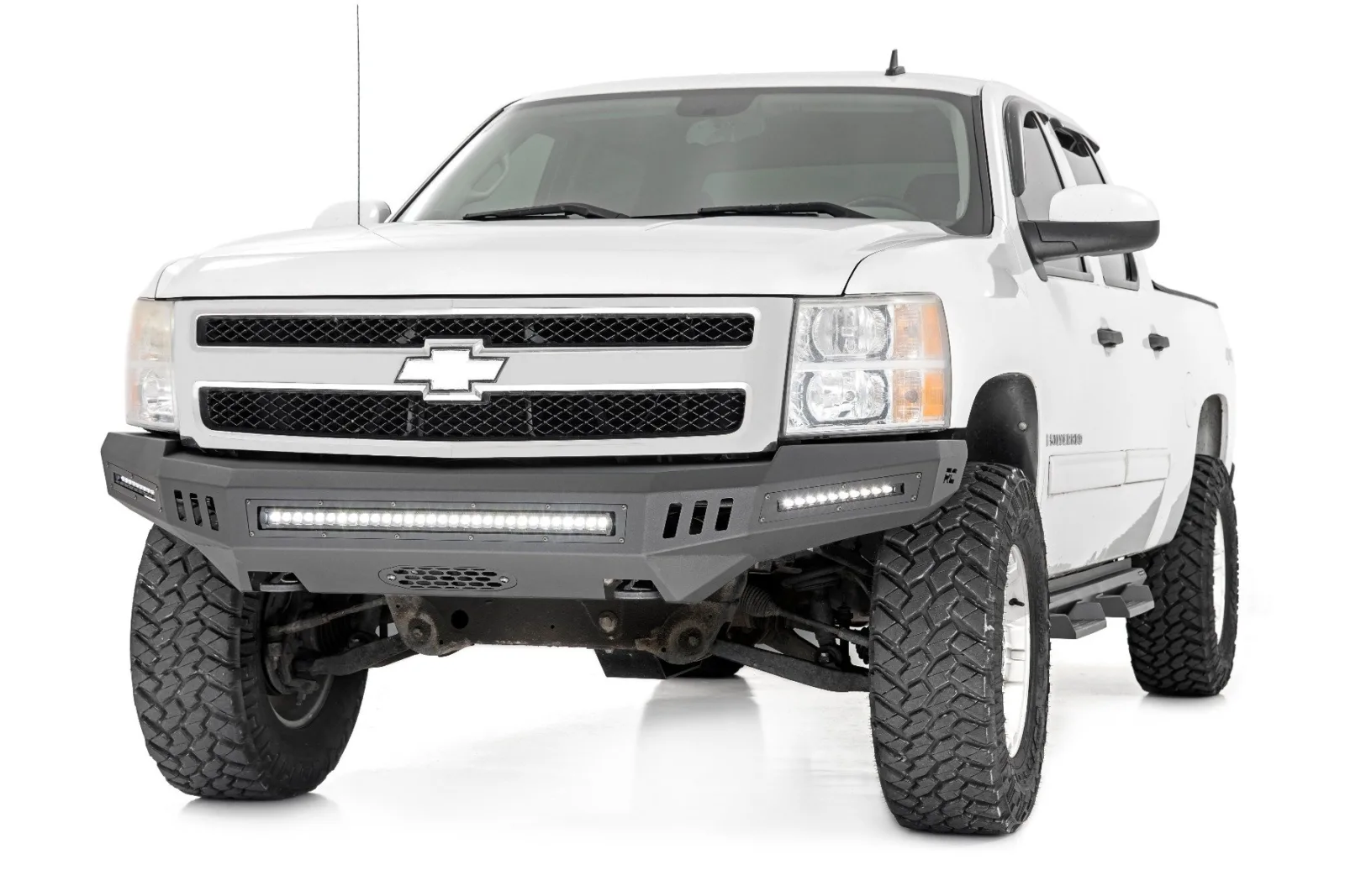 Update the look of your 07-13 Chevy Silverado 1500 with Rough Country’s High Clearance Bumper. This cost effective mod comes ready to install straight out of the box, giving your truck the tough look it deserves quickly and easily. Rough Country’s High Clearance Bumper is modular, you can pick and choose the options best suited to your needs and the look you re going for. Each bumper features trim plates and mounting options that allow you to run a series of LED lights for impressive illumination and includes a winch mounting plate. Optional LED upgrade kit includes (1) 30in Single Row LED and (2) 10in Slimline LEDs. For a more classic look, simply use the provided trim panels for a sleeker appearance. Our High Clearance Bumper comes with durable, flat black powder coat finish, ready to withstand the elements -No painting required for a hassle-free install.