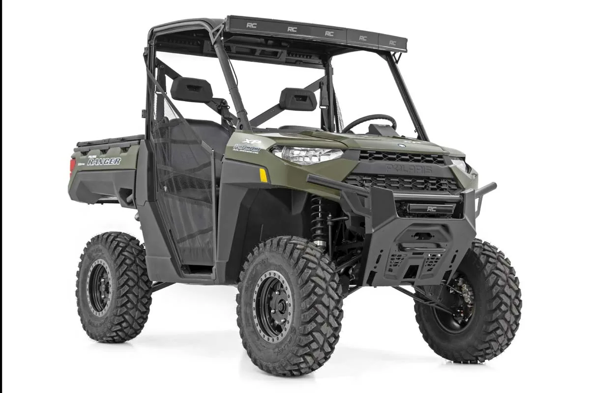 COMMAND THE DARK with Rough Country’s 12-inch LED Bumper Kit for Polaris Ranger models. This handy solution includes everything you need to upgrade your Ranger with a Rough Country 12-inch LED light bar mounted into the factory bumper for outstanding illumination. Choose between our standard black series or DRL black-series for the look and output you desire. Each light can be pitched upward, downward, or straight ahead to illuminate however you see fit. Whether you re off the beaten path at sunset or gathering all your gear before dawn, you ll be glad to have access to this additional lighting power to tackle the task at hand. With up to 4,800 lumens and 60 watts of high-intensity CREE LED output, you re sure to have plenty of LED power. These all-weather lights feature a durable, IP67 Waterproof, die-cast aluminum housing and include a premium wiring harness with toggle switch and in-line fuse. Best of all, this easy-to-install kit features a 100% bolt-on installation procedure allowing you to upgrade your side by side quickly and easily! Don t miss this opportunity to upgrade your UTV with one of the best Polaris Ranger LED accessories available!