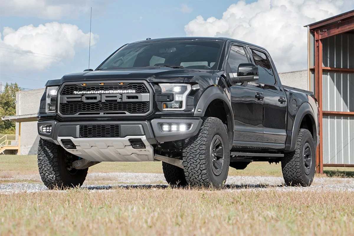 Bring the illuminating power of Rough Country’s 30-inch Single-Row Curved LED to your Ford Raptor with Rough Country’s discreet 30-inch LED Hidden Grille Kit. This unique lighting kit behind the grille, perfectly holding your 30-inch Curved Single-Row LED Light Bar in the proper location for both ample lighting and airflow. This LED Hidden Grille Kit blends in so well it looks like factory equipment!. This LED kit is installed in the perfect position for forward-facing illumination, mounted just above the unique Raptor GFord” logo. Turn it on and light floods outward, giving you unparalleled access to off-road lighting in a clean, flush kit. Rough Country’s LED Light Bars include a durable die-cast aluminum, IP67 waterproof housing for unsurpassed protection against the elements. Each LED also features a premium flat-wound, braided, IP68 waterproof wiring harness with a toggle switch and in-line fuse. Includes Rough Country’s 3-year LED Warranty and Lifetime Mount Warranty.