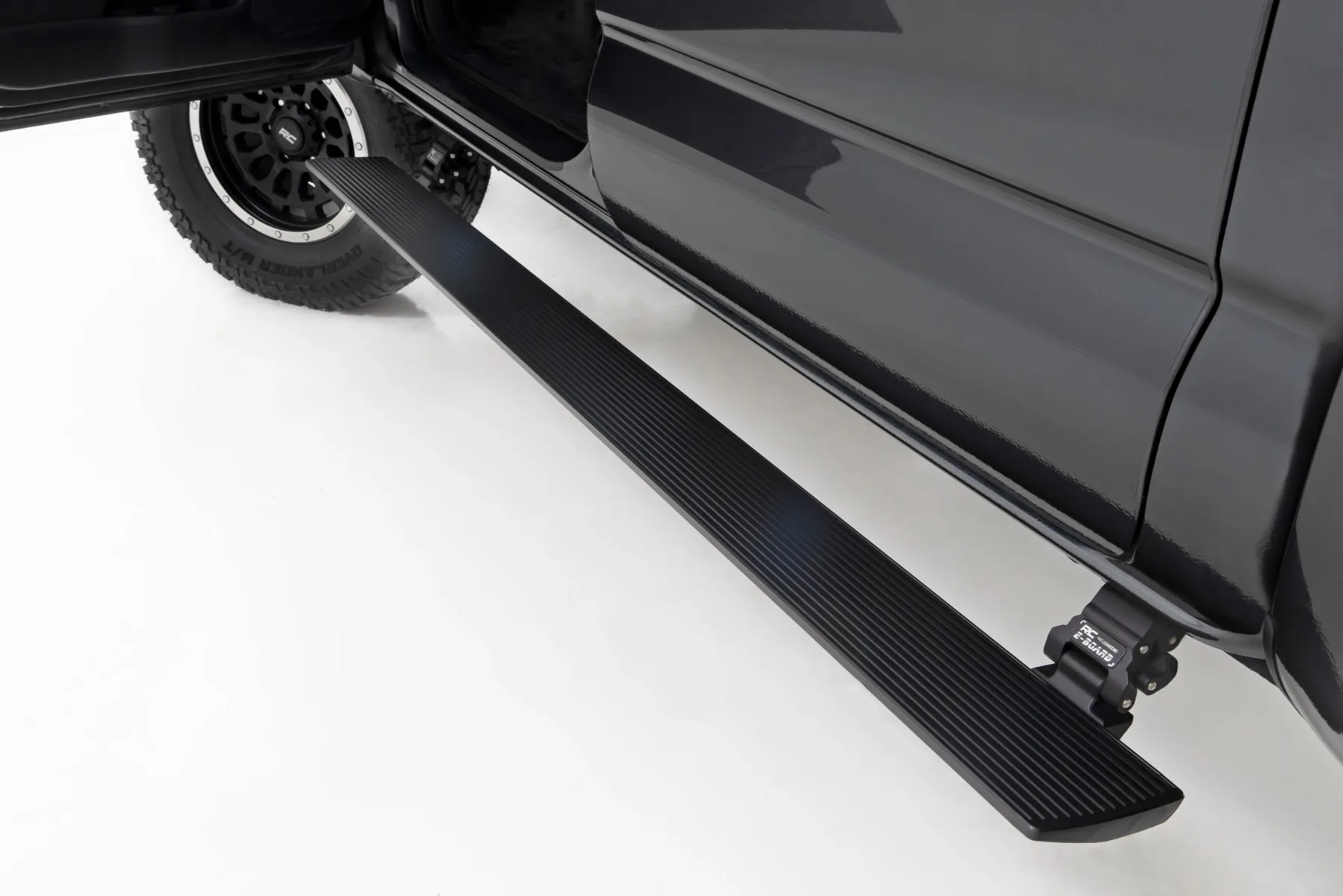 Step up in style. Sidesteps have come a long way, and now we’ve taken them to the next level with Rough Country’s Power Running Boards! These retractable E-Boards tuck tight for a clean look when not in use and automatically extend when the door is opened. With an anti-slip surface that provides a secure stepping area, getting in and out of your ride has never been easier. Our Power Running Boards also include LED lights that provide illumination when deployed and shut off when steps are closed, providing a sleek, aerodynamic look. Premium Construction. The Rough Country E-Board Steps combine durability, strength, and style. These 6″ all-season steps are made from lightweight yet durable aluminum and can support up to 660 lbs. per side. Equipped with dual motor technology, these steps can handle anything Mother Nature throws their way. They feature an automatic ‘SAFE-STOP’ mechanism that engages if a blockage is detected and include an interior bypass switch for manual override. So whether you’re heading out on a weekend errand or loading up for a camping trip, our electric steps offer reliable protection for all your adventures. Installation. These easy-to-install steps are the perfect solution for getting in and out of your vehicle. No drilling is required for installation, and the steps tuck tight under the rocker panel when not i n use. Don’t struggle to get in and out of your vehicle anymore. Make life easier with Rough Country’s Power Running Boards. Warranty. Rough Country backs its products with a five-year limited replacement warranty. Our products are protected from structural and workmanship damage after purchase. Our industry-leading warranty gives you peace of mind when using Rough Country products!