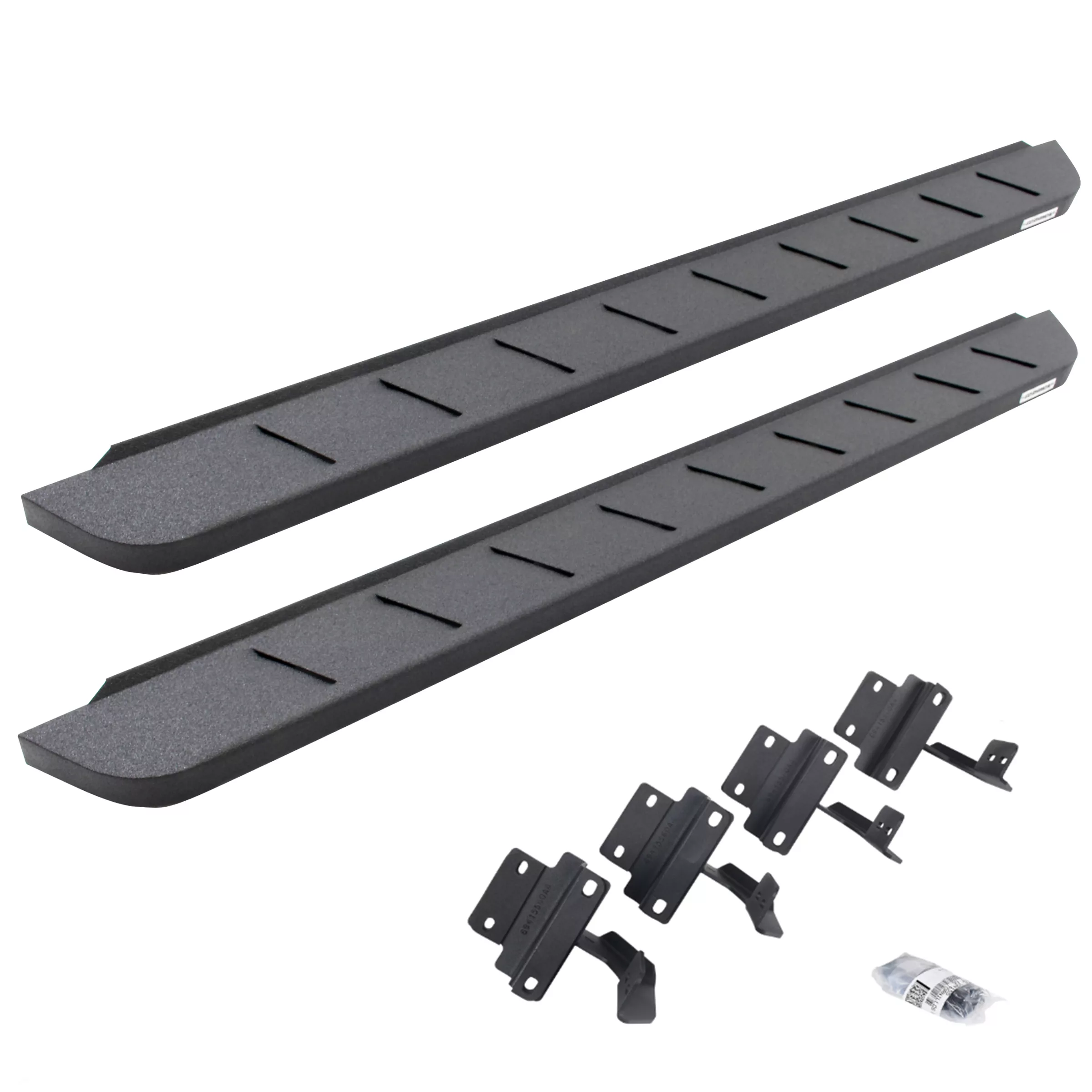 The legendary RB Series of cab length running boards from Go Rhino will make your truck, Jeep or SUV stand apart from the crowd. With an aggressive, yet stylish appearance, these bolt-on side steps take their visual inspiration from the Ford Raptor but are made for more than just looks. The RB10 running boards features a generous step area with Raptor-style louvers for maximum traction. The corrosion-resistant 16-gauge zinc coated steel steps are mounted high and tight, giving them plenty of clearance for off-road adventures, and are strong enough to support hundreds of pounds of weight. The welded, boxed end design is offered in textured black powder coat or rugged, bedliner coating. Hardware and brackets are included and installation on most vehicles will not require drilling. RB10 Running Board Kits come with a Limited Lifetime warranty on materials and construction and a 5 year warranty on the Bedliner finish.