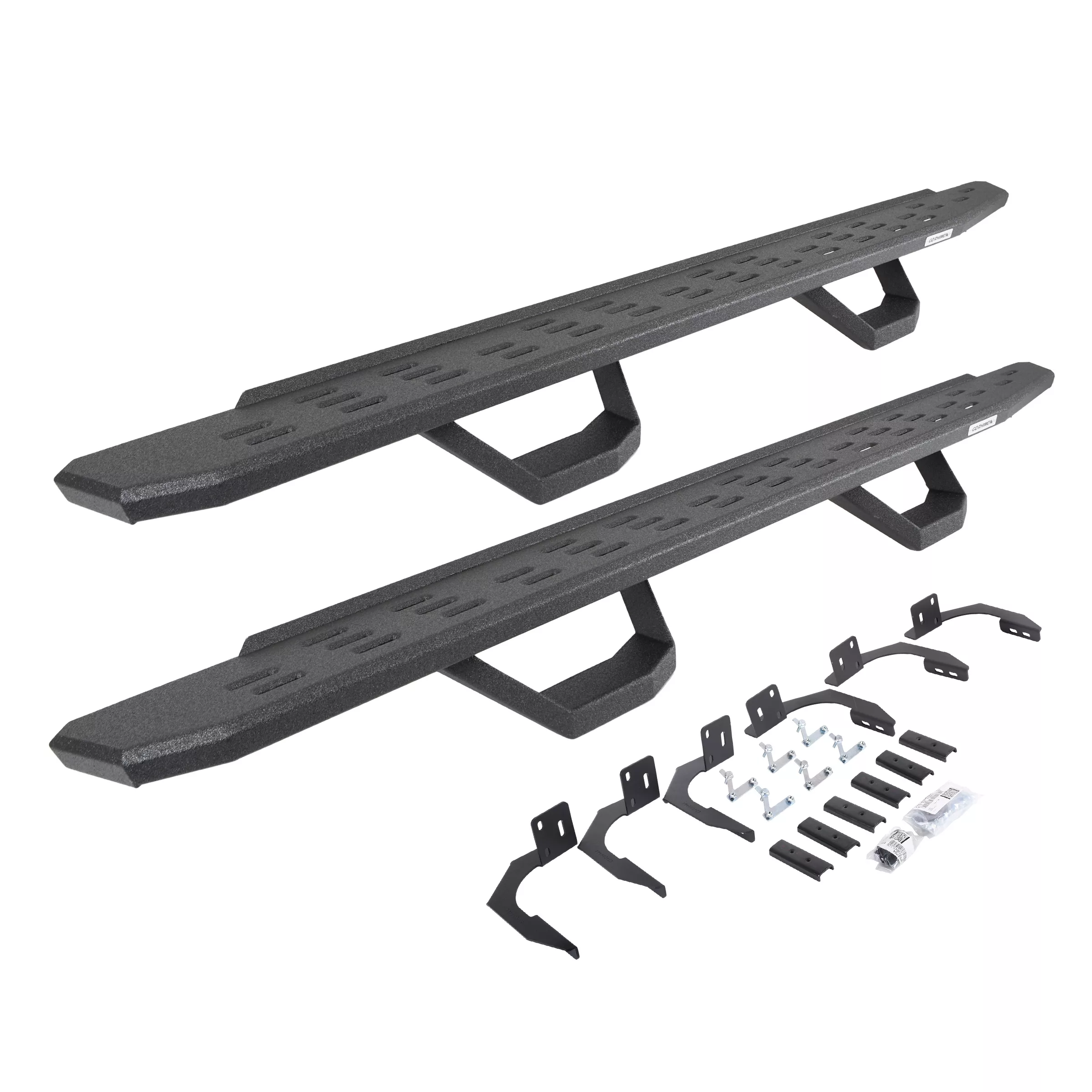 Meet the third edition of the legendary Go Rhino RB Series of running boards: the RB30. The RB30 is the next generation of Raptor-inspired design that will make your truck, Jeep, Bronco or SUV stand out from the crowd. With its aggressive, stylish appearance, this cab-length, bolt-on side step provides maximum traction and features an open flow-through design that prevents mud, ice, and snow from accumulating. The corrosion-resistant 16-gauge steel step mounts tightly to factory mounting points along the lower rocker panel, providing plenty of clearance for off-roading, and it’s strong enough to support 300 lbs. per stepping surface for 600 lbs. per board. Matching drop steps will make entering and exiting lifted vehicles even easier. The RB30 Running Board is 7” wide for most its length before it tapers (compared to 5” wide for the Slim Line version). All RB Series Running Boards are available in Textured Black Powder Coat or Protective Bedliner finish, made in North America and offer a limited lifetime warranty against manufacturer and material defects, with a 5-year warranty on the finish.