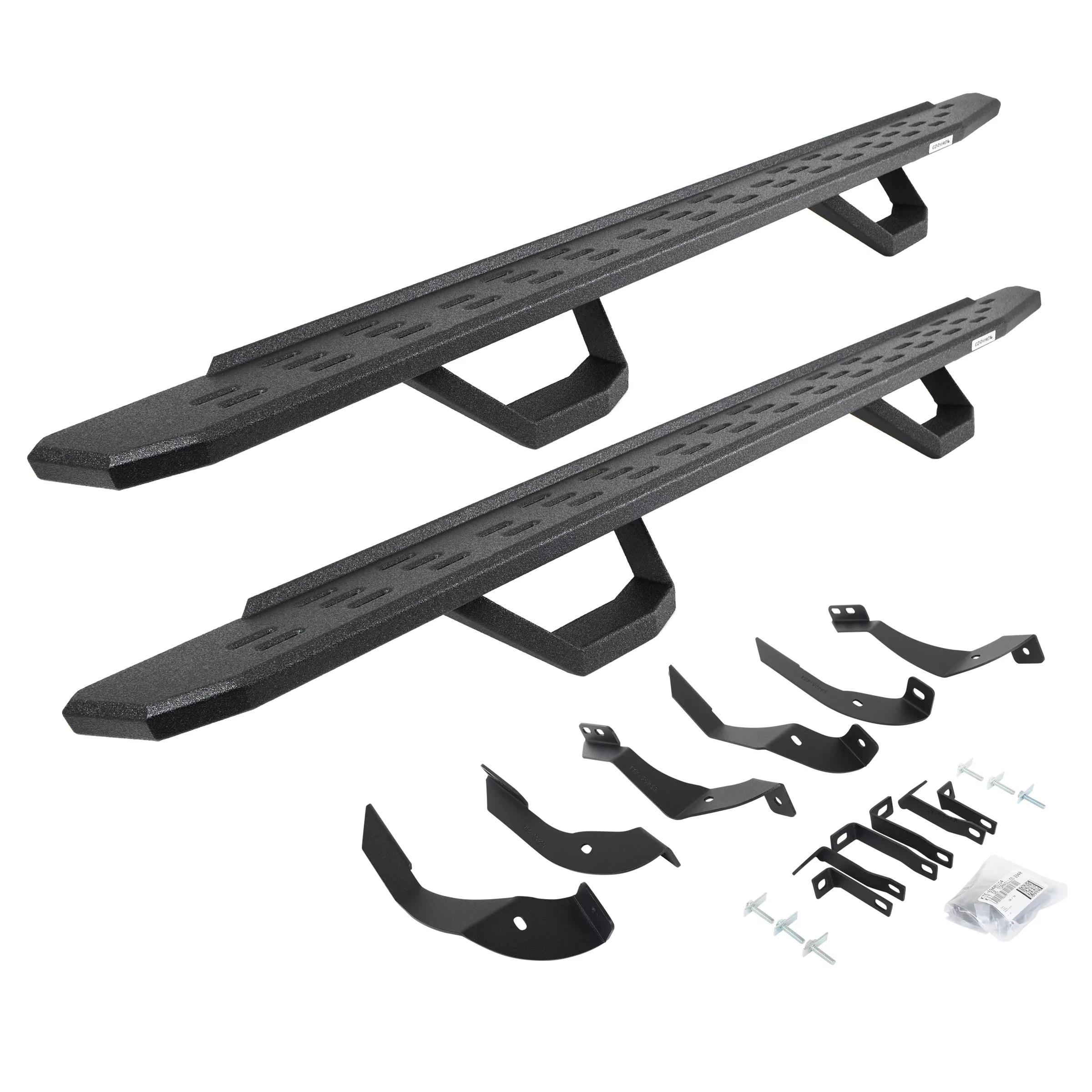 Meet the third edition of the legendary Go Rhino RB Series of running boards: the RB30. The RB30 is the next generation of Raptor-inspired design that will make your truck, Jeep, Bronco or SUV stand out from the crowd. With its aggressive, stylish appearance, this cab-length, bolt-on side step provides maximum traction and features an open flow-through design that prevents mud, ice, and snow from accumulating. The corrosion-resistant 16-gauge steel step mounts tightly to factory mounting points along the lower rocker panel, providing plenty of clearance for off-roading, and it’s strong enough to support 300 lbs. per stepping surface for 600 lbs. per board. Matching drop steps will make entering and exiting lifted vehicles even easier. The RB30 Running Board is 7” wide for most its length before it tapers (compared to 5” wide for the Slim Line version). All RB Series Running Boards are available in Textured Black Powder Coat or Protective Bedliner finish, made in North America and offer a limited lifetime warranty against manufacturer and material defects, with a 5-year warranty on the finish.