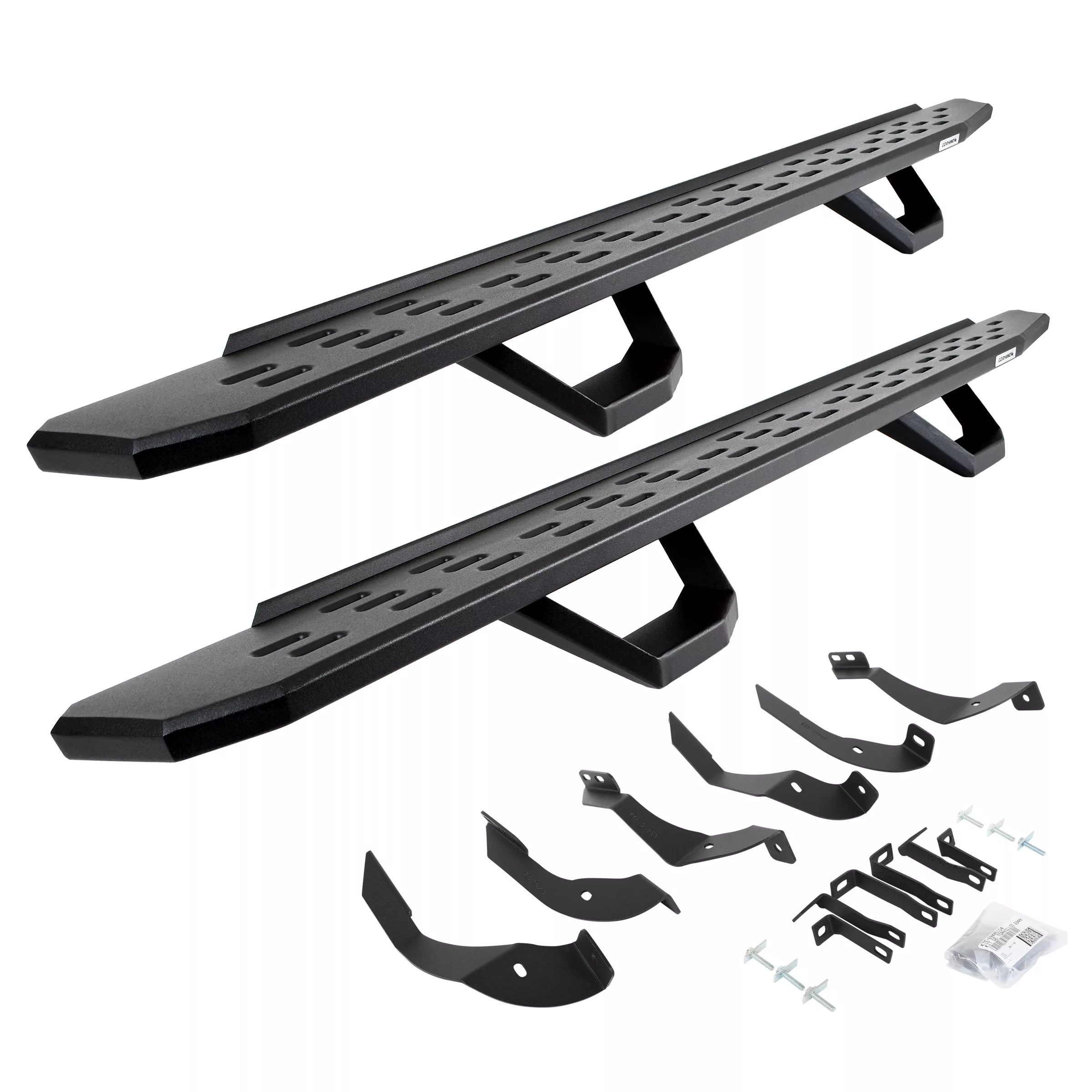 Meet the third edition of the legendary Go Rhino RB Series of running boards: the RB30. The RB30 is the next generation of Raptor-inspired design that will make your truck, Jeep, Bronco or SUV stand out from the crowd. With its aggressive, stylish appearance, this cab-length, bolt-on side step provides maximum traction and features an open flow-through design that prevents mud, ice, and snow from accumulating. The corrosion-resistant 16-gauge steel step mounts tightly to factory mounting points along the lower rocker panel, providing plenty of clearance for off-roading, and it’s strong enough to support 300 lbs. per stepping surface for 600 lbs. per board. Matching drop steps will make entering and exiting lifted vehicles even easier. The RB30 Running Board is 7” wide for most its length before it tapers (compared to 5” wide for the Slim Line version). All RB Series Running Boards are available in Textured Black Powder Coat or Protective Bedliner finish, made in North America and offer a limited lifetime warranty against manufacturer and material defects, with a 5-year warranty on the finish.