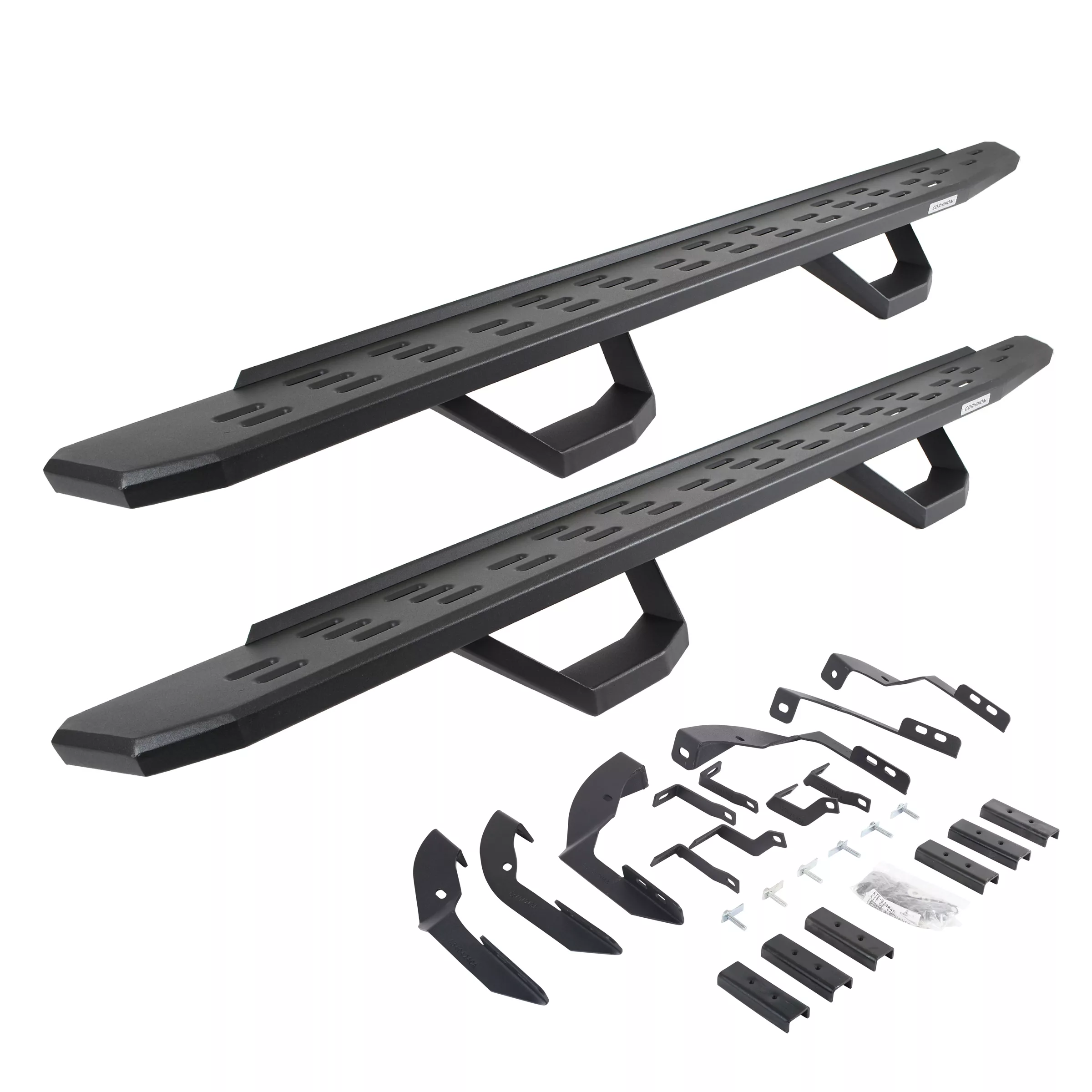 Meet the third edition of the legendary Go Rhino RB Series of running boards: the RB30. The RB30 is the next generation of Raptor-inspired design that will make your truck, Jeep, Bronco or SUV stand out from the crowd. With its aggressive, stylish appearance, this cab-length, bolt-on side step provides maximum traction and features an open flow-through design that prevents mud, ice, and snow from accumulating. The corrosion-resistant 16-gauge steel step mounts tightly to factory mounting points along the lower rocker panel, providing plenty of clearance for off-roading, and it’s strong enough to support 300 lbs. per stepping surface for 600 lbs. per board. Matching drop steps will make entering and exiting lifted vehicles even easier. The RB30 Running Board is 7” wide for most its length before it tapers (compared to 5” wide for the Slim Line version). All RB Series Running Boards are available in Textured Black Powder Coat or Protective Bedliner finish, made in North America and offer a limited lifetime warranty against manufacturer and material defects, with a 5-year warranty on the finish.