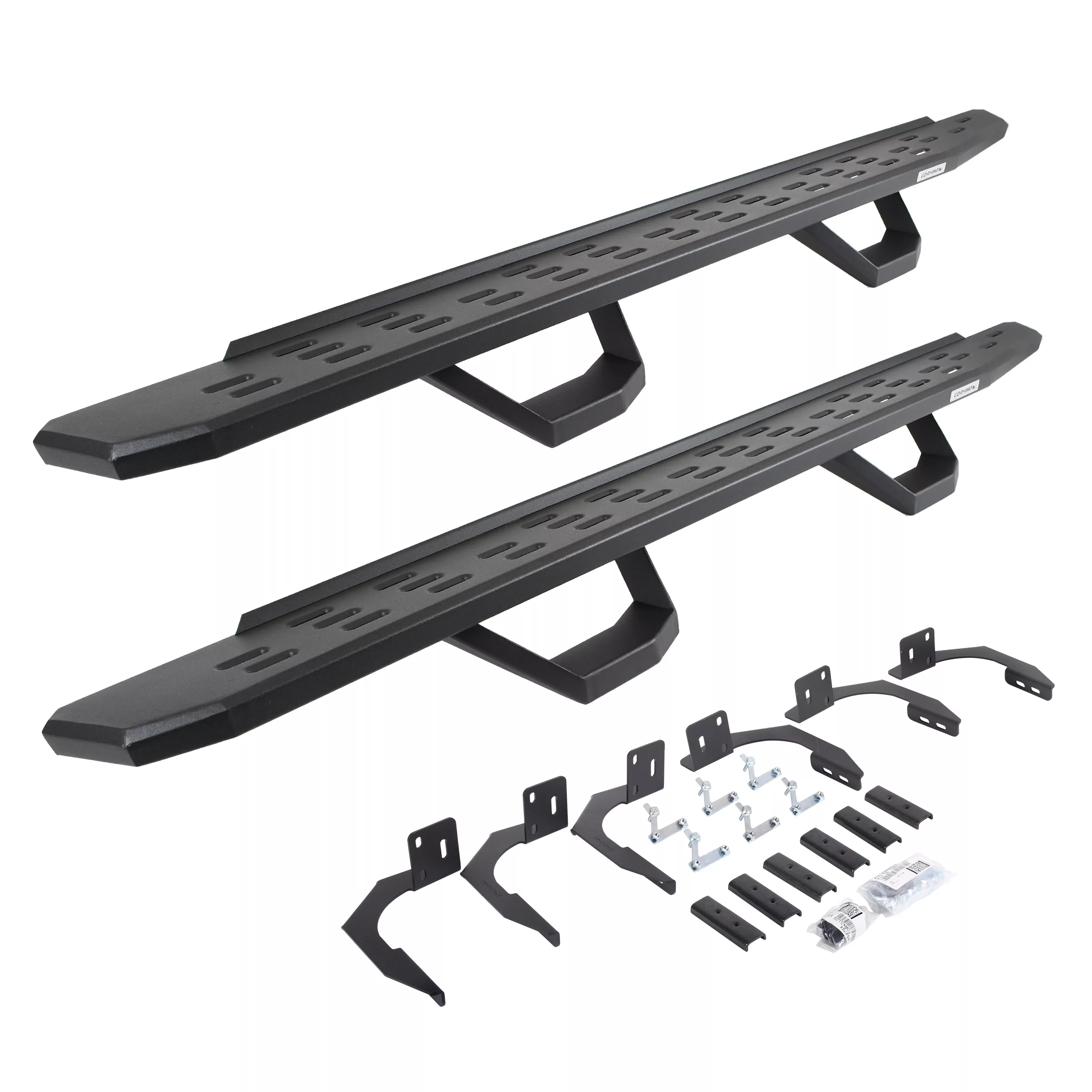 Meet the third edition of the legendary Go Rhino RB Series of running boards: the RB30. The RB30 is the next generation of Raptor-inspired design that will make your truck, Jeep, Bronco or SUV stand out from the crowd. With its aggressive, stylish appearance, this cab-length, bolt-on side step provides maximum traction and features an open flow-through design that prevents mud, ice, and snow from accumulating. The corrosion-resistant 16-gauge steel step mounts tightly to factory mounting points along the lower rocker panel, providing plenty of clearance for off-roading, and it’s strong enough to support 300 lbs. per stepping surface for 600 lbs. per board. Matching drop steps will make entering and exiting lifted vehicles even easier. The RB30 Running Board is 7” wide for most its length before it tapers (compared to 5” wide for the Slim Line version). All RB Series Running Boards are available in Textured Black Powder Coat or Protective Bedliner finish, made in North America and offer a limited lifetime warranty against manufacturer and material defects, with a 5-year warranty on the finish.