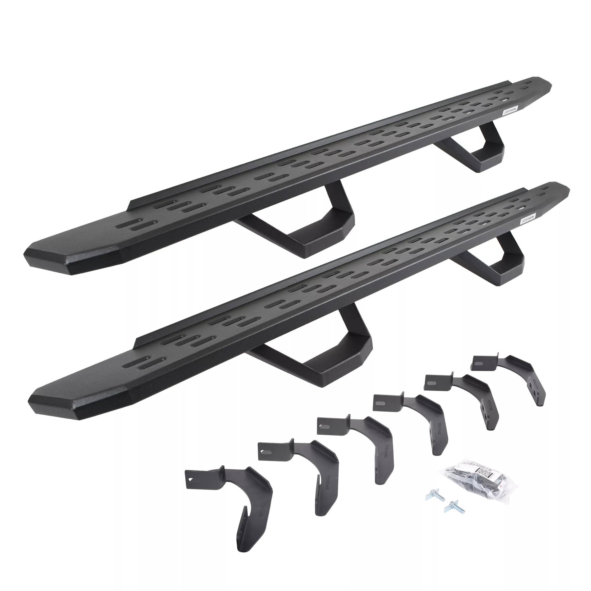 Meet the third edition of the legendary Go Rhino RB Series of running boards: the RB30. The RB30 is the next generation of Raptor-inspired design that will make your truck, Jeep, Bronco or SUV stand out from the crowd. With its aggressive, stylish appearance, this cab-length, bolt-on side step provides maximum traction and features an open flow-through design that prevents mud, ice, and snow from accumulating. The corrosion-resistant 16-gauge steel step mounts tightly to factory mounting points along the lower rocker panel, providing plenty of clearance for off-roading, and it’s strong enough to support 300 lbs. per stepping surface for 600 lbs. per board. Matching drop steps will make entering and exiting lifted vehicles even easier. The RB30 Running Board is 7” wide for most its length before it tapers (compared to 5” wide for the Slim Line version). All RB Series Running Boards are available in Textured Black Powder Coat or Protective Bedliner finish, made in North America and offer a limited lifetime warranty against manufacturer and material defects, with a 5-year warranty on the finish.