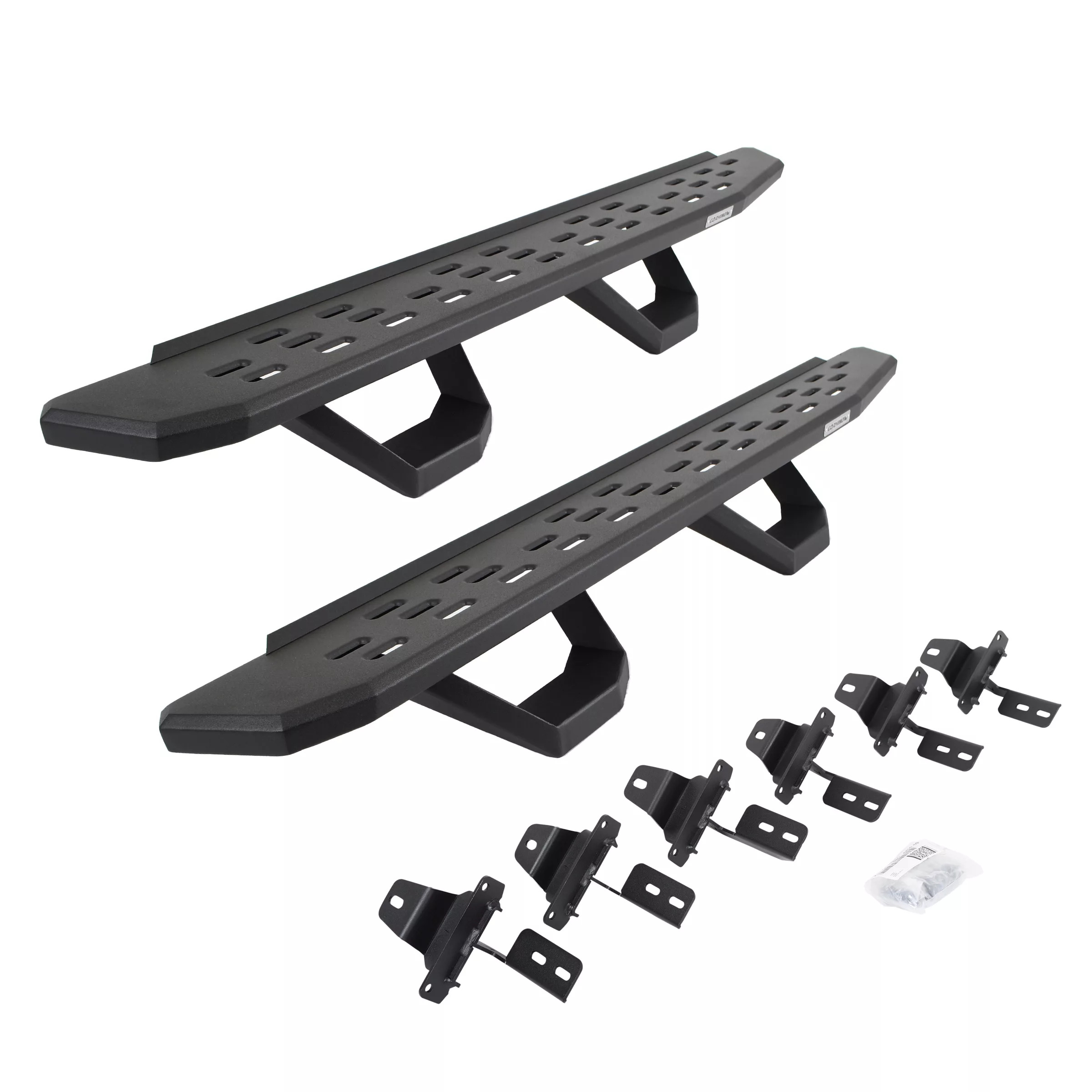 Meet the third edition of the legendary Go Rhino RB Series of running boards: the RB30. The RB30 is the next generation of Raptor-inspired design that will make your truck, Jeep, Bronco or SUV stand out from the crowd. With its aggressive, stylish appearance, this cab-length, bolt-on side step provides maximum traction and features an open flow-through design that prevents mud, ice, and snow from accumulating. The corrosion-resistant 16-gauge steel step mounts tightly to factory mounting points along the lower rocker panel, providing plenty of clearance for off-roading, and it’s strong enough to support 300 lbs. per stepping surface for 600 lbs. per board. Matching drop steps will make entering and exiting lifted vehicles even easier. The RB30 Running Board is 7” wide for most its length before it tapers (compared to 5” wide for the Slim Line version). All RB Series Running Boards are available in Textured Black Powder Coat or Protective Bedliner finish, made in North America and offer a limited lifetime warranty against manufacturer and material defects, with a 5-year warranty on the finish.