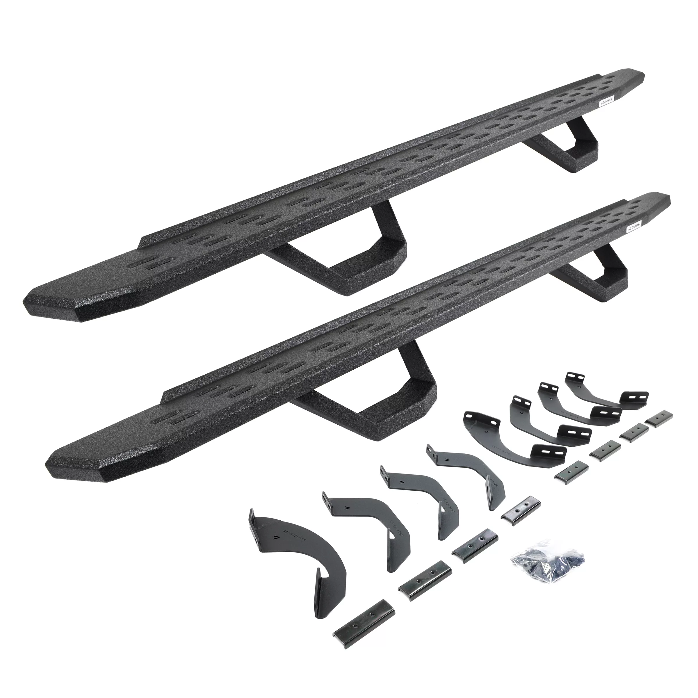 Meet the third edition of the legendary Go Rhino RB Series of running boards: the RB30. The RB30 is the next generation of Raptor-inspired design that will make your truck, Jeep, Bronco or SUV stand out from the crowd. With its aggressive, stylish appearance, this cab-length, bolt-on side step provides maximum traction and features an open flow-through design that prevents mud, ice, and snow from accumulating. The corrosion-resistant 16-gauge steel step mounts tightly to factory mounting points along the lower rocker panel, providing plenty of clearance for off-roading, and it’s strong enough to support 300 lbs. per stepping surface for 600 lbs. per board. Matching drop steps will make entering and exiting lifted vehicles even easier. The RB30 Running Board is 7” wide for most its length before it tapers (compared to 5” wide for the Slim Line version). All RB Series Running Boards are available in Textured Black Powder Coat or Protective Bedliner finish, made in North America and offer a limited lifetime warranty against manufacturer and material defects, with a 5-year warranty on the finish.