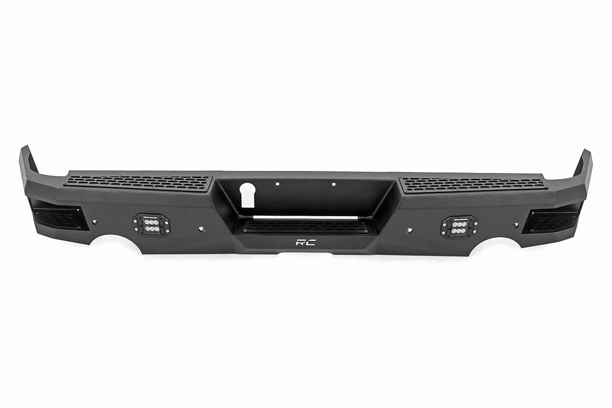 Give the rear of your 09-18 Ram 1500 an aggressive, new appearance with Rough Country’s Rear LED Bumper. This easy-to-install upgrade gives your truck an improved look and better functionality, with two pre-installed Rough Country LED cubes that offer impressive off-road illumination! Rough Country’s Rear LED Bumper is made of a durable, all-steel construction that s ready to handle whatever you dish out. Each bumper features two Rough Country Black-Series 2in LED Flush Mount Cubes for rear illumination, and two integrated steps for easy access to the bed. Each bumper also includes sensor relocators to allow you to retain the vehicle’s anti-collision system. Unlike some aftermarket bumpers for this model, Rough Country’s LED Rear Bumper allows you to retain the factory receiver hitch for towing. Rough Country’s Rear LED Bumper is easy to install with common tools in a home garage! Best of all each bumper includes a 3-year warranty!
