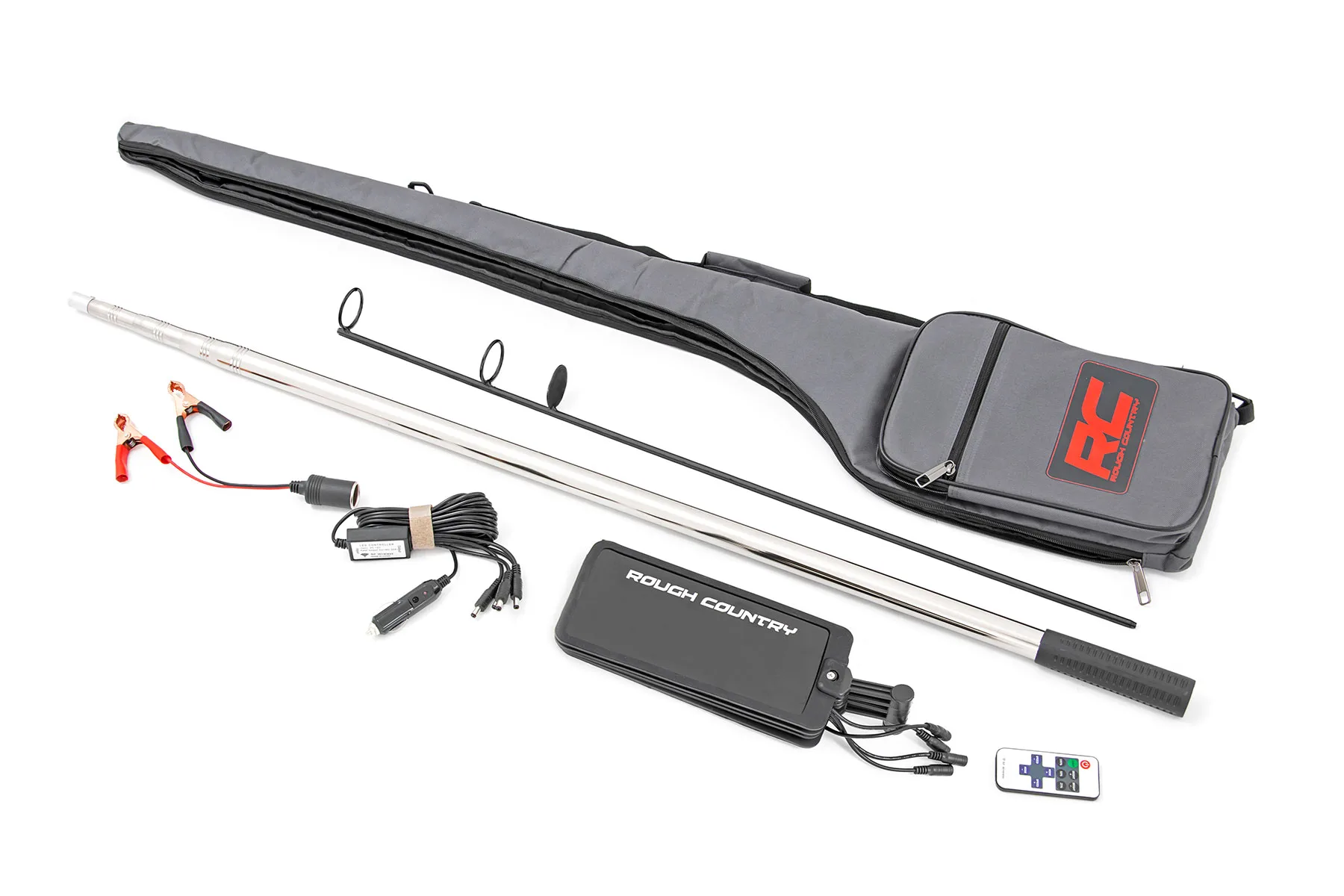 Take your campsite to the next level with Rough Country’s LED Outdoor Light Kit. This collapsible LED Light Kit offers impressive illumination to ensure visibility throughout all of your outdoor adventures. Rough Country’s LED Outdoor Light Kit features a illumination range of up to 160ft while settling on a telescopic pole that can reach 16 feet in the air! Rough Country’s LED Outdoor Light Kit plugs right into your UTV or vehicle with a DC cord, or can be ran directly to the vehicles battery. Featuring a jaw dropping 6200 lumens and 64 watts of raw power. This LED light kit turns night into day boasting a total of 912 LED’s between a four LED light panels. Rough Country’s LED Outdoor Light Kit has a IP67 waterproof rating for unsurpassed protection against the elements. Controlling this unit is a breeze with an included wireless remote that offers dimmer presets, light mode, toggle flash speeds and brightness! For peace of mind, each LED kit also include Rough Country’s 1-year Warranty.