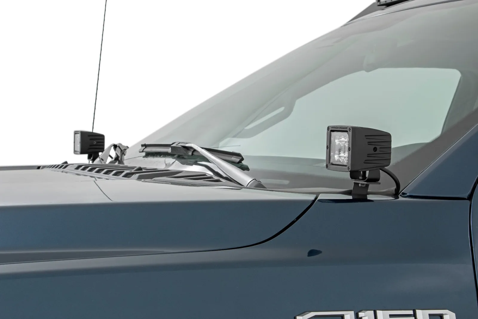 Whether it s off-road riding at night or navigating the trails after hours, Rough Country’s Lower Windshield LED Ditch Mounts gives you the strong side illumination you need. Never miss another turn, and safely maneuver through any off-road situation in the dark without obstructing visibility from inside the cab. This easy to install mounting system is low profile and features 100% bolt-on installation procedure, with no need for cutting or drilling needed. The LED Cubes tuck nicely along the base of the windshield and pack impressive lighting power. Each Rough Country LED light cube is IP67 Waterproof and includes a premium, braided wiring harness with in-line fuse and on/off swit ch. This kit Includes Rough Country’s 3-year LED warranty.