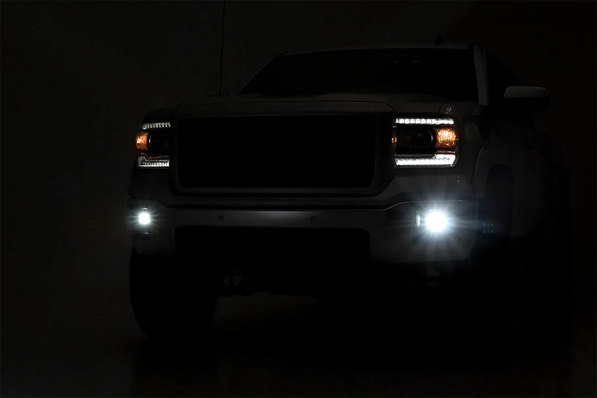 Bring the state-of-the-art power and efficiency of LED lighting to your GMC 1500 s factory fog lights with Rough Country’s 2-inch Fog Light LED Kit. This clever LED & mount combo allows you to swap out the factory fog lights with Rough Country’s 2-inch LED Cubes, offering increased illumination and killer, good looks that blend right in with the 2014-2015 Sierra 1500 design. Light up the road with 36 watts and 2880 Lumens of output power. These all-weather LED lights feature a die-cast aluminum housing and include a wiring harness that easily connects to the factory fog light wiring. Includes a 3-Year Manufacturer s Warranty.