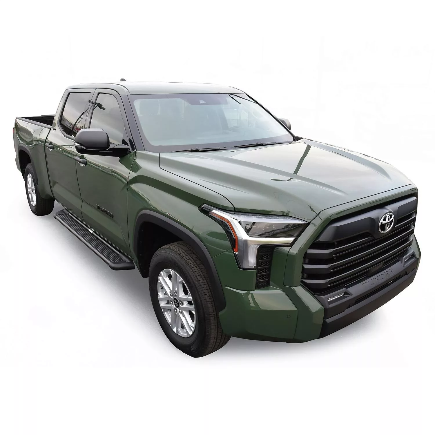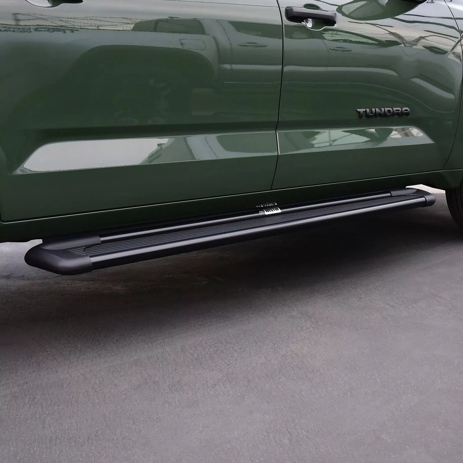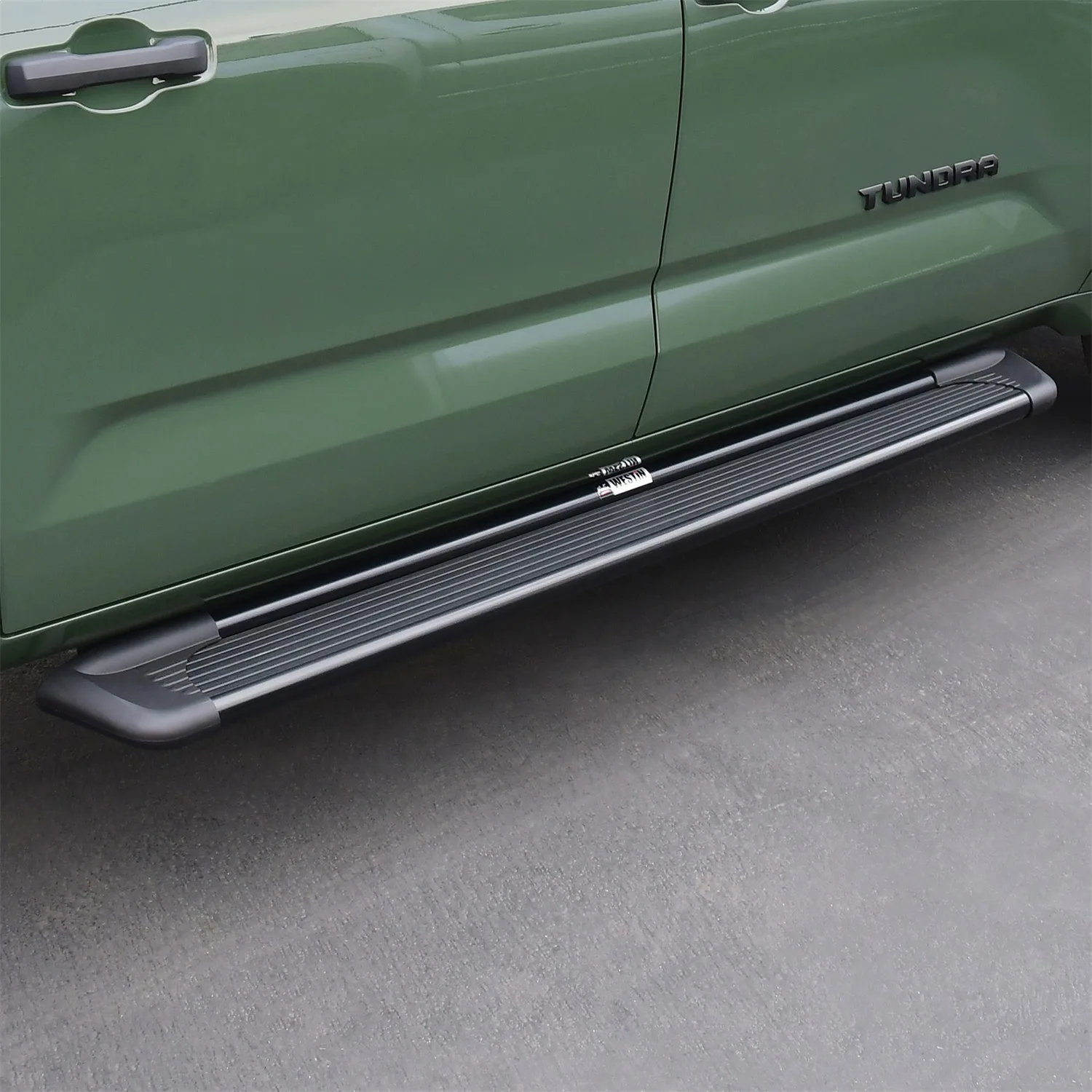 Extruded aluminum. Slip resistant rubber step area. Molded end caps add unique style. Cradle mounted boards. 5 year warranty.