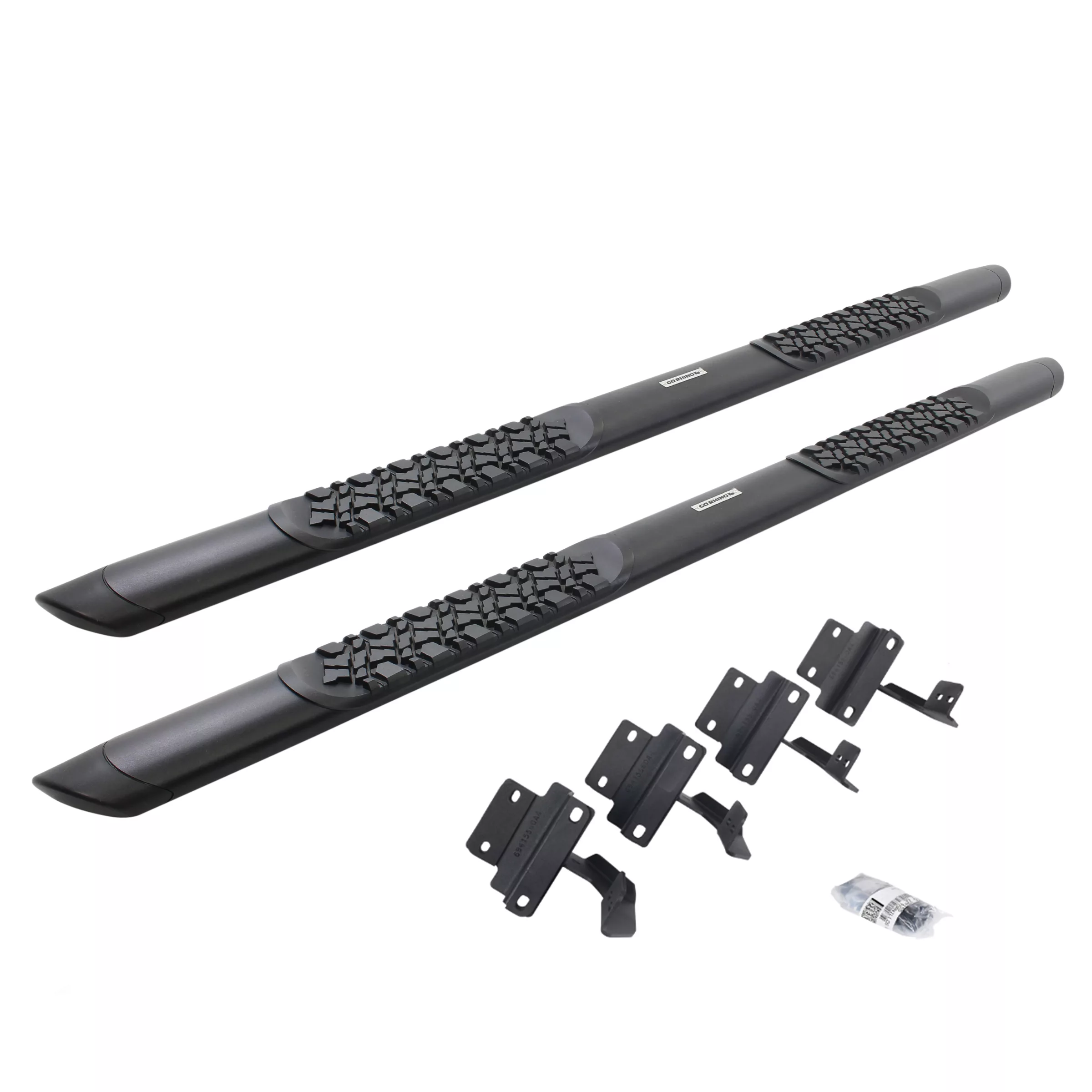 Go Rhino’s V3 side steps bring on a sleek, aerodynamic look, the convenience of corrosion-resistant aluminum and strength based on quality engineering and design. Finished with a textured black powder coating, the 5” wide ellipse-shaped boards feature anti-slip polymer step pads with a multi-dimensional tire tread pattern so rain, snow and slush easily drain off and reduce the risk of slipping while stepping up into your vehicle. Each V3 board is fortified with a dual core full length extrusion allowing the board to support up to 300 lbs per step pad (600 lbs per side for 4-door vehicles). Hardware and brackets are included and installation on most vehicles will not require drilling. The V3 Side Steps come with a Limited Lifetime warranty on materials and construction and a 5 year warranty on the Textured Black Finish.
