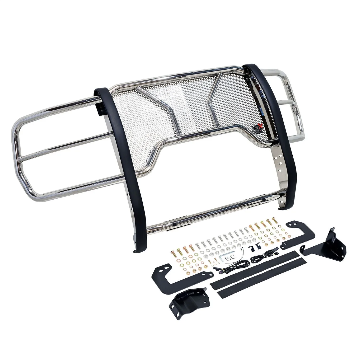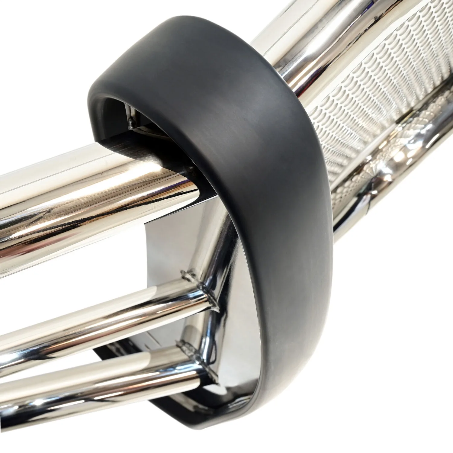 The HDX Grille Guard is the ultimate in extreme truck gear. It’s a fully welded 1-piece grille guard that features full wraparound wings made of heavy duty 2 in. diameter tube. Uprights are finished and protected with extra wide rubber strip that is 1/8 in. thick and 2 3/4 in. wide resulting in a solid clean look. The full punch plate grille protects the vehicle’s grille area. HDX Grille Guards are available in stainless and black powder coat finish.