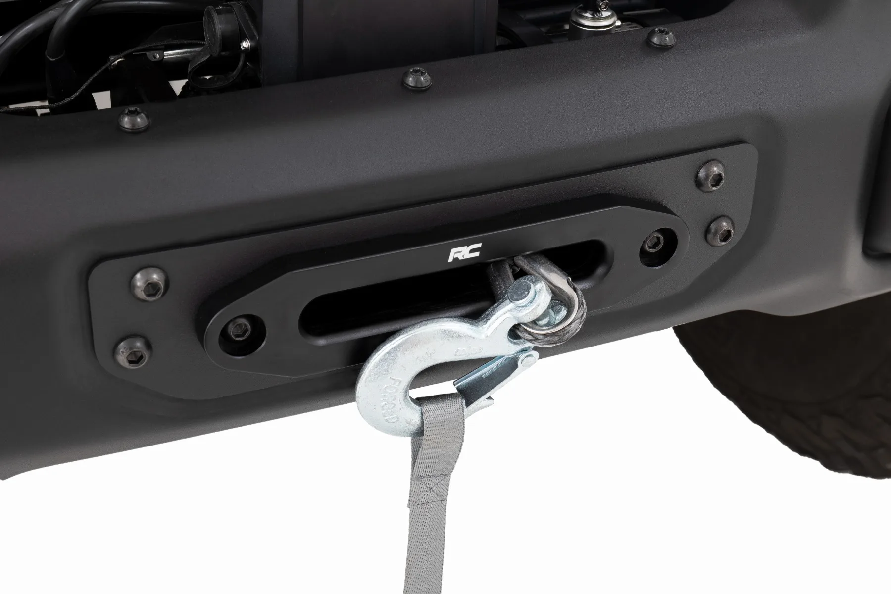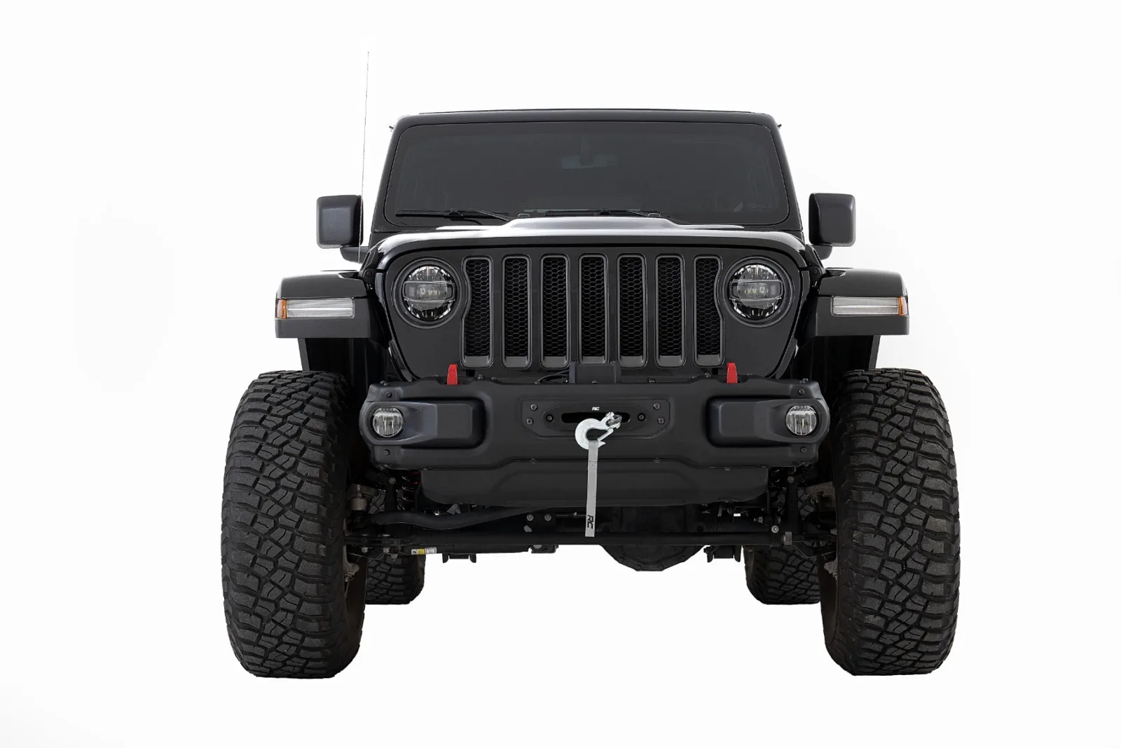 Superior Style. Get ready for off-road adventures with Rough Country’s Winch Mounting Plate for the Jeep Wrangler JL 4WD. This stylish recovery solution is hidden behind the OEM modular steel bumper for a sleek look while still providing the functionality you need. The standard 4.5in x 10in 4 bolt mount will accommodate most winches on the market, giving you the versatility to choose the right winch for your needs. Heavy-Duty Steel Construction. Rough Country’s Winch Mounting Plate is the perfect addition to your JL. With its durable black c arbon powder coating and heavy-duty 7GA steel construction, this mounting plate can handle anything the off-road throws at it. It has been engineered NOT to impede airflow to the radiator, so you can tackle any obstacle without worrying about your engine overheating. The flush design leaves only the hawse fairlead and tow hook exposed, giving your Jeep a clean, polished look while ensuring maximum functionality. Installation and Warranty. Since the front bumper stays in its stock location, installing our Winch Plate is a breeze and can be completed by just one person. And with Rough Country’s commitment to quality, you can have peace of mind with the included Limited Lifetime Warranty.