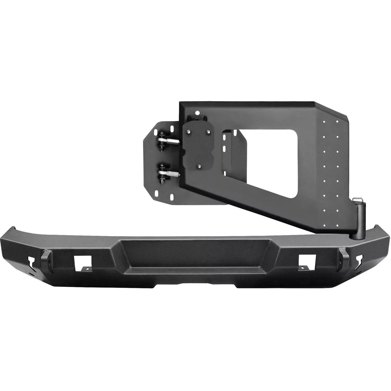 Westins WJ2 Rear Bumper with Tire Carrier is constructed with 3/16-inch plate steel with an 8 gauge tire carrier. The tire carrier is designed to work with or without factory or Westin hitches, and opens and closes with the tailgate. Tapered roller bearings and 2 turnbuckle heim links improve carrier rigidity while its bolt-on spindle allows adjustment of the carrier separate from the bumper. Features integrated recovery shackle mount points as well as additional mount points for Auxiliary Lights and Rock Lights. Includes 2 off-road jack points, license plate locator, trailer plug, fender gap transition plates, camera back-up relocator and more. Offers a bottom frame mount that helps prevents the bumper from rotating. Product includes bumper, mounting hardware and install instructions.